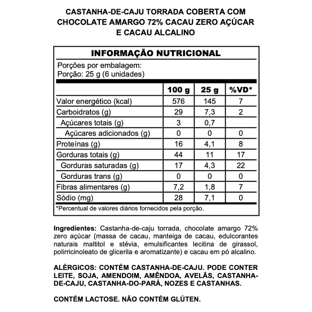 🎉 Sabor Aclamado: Assim como sua contraparte com açúcar, a Castanha de Caju Drageada com Chocolate 73% Cacau Zero Açúcar também é aclamada por proporcionar um prazer gourmet que atende às necessidades de um estilo de vida mais consciente.