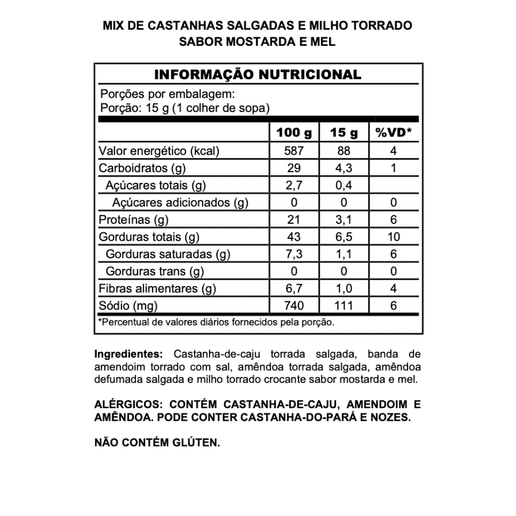 🌳 Das Castanhas de Caju Torradas com Sal, que combinam a crocância da castanha com um toque de sal, às Amêndoas Torradas com Sal, que trazem uma suavidade equilibrada, o nosso Mix é uma celebração da textura e do sabor. A adição das Amêndoas Defumadas, do Milho Torrado com Sal sabor Mostarda e Mel e do Amendoim Torrado com Sal proporciona uma variedade de aromas e experiências únicas.